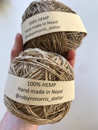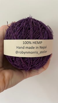 Single twist 100% Nepalese hemp twine. Approx 1mm thick but as it’s a hand made product the gauge is not consistent. It has the odd thick and thin bit throughout giving it its rustic character. Note: it’s wound double onto the ball. I use it double directly from the ball, but have successfully separated to make two balls of single twine. They are hand wound and the weight varies, the minimum weight being 95gms. I made the two crochet hemp and vine baskets listed on my site with one ball.