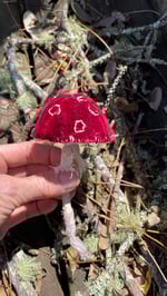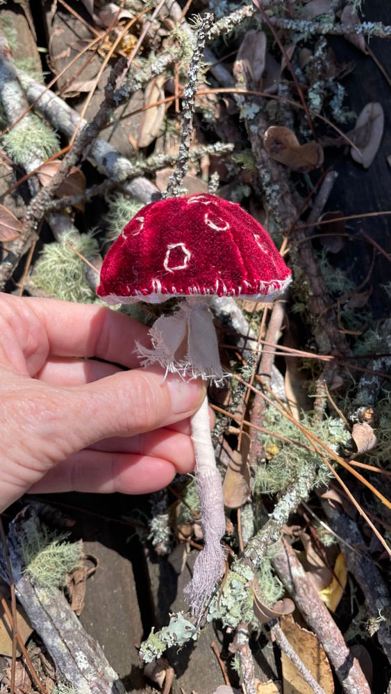 Hand stitched mushroom from my extensive stash of vintage fabrics. Each brooch is hand stitched, the roots dipped in coffee dye & spots hand appliquéd or embroidered. Some have a black inside some natural linen. this one has a cotton stripe underside. approx 6cm diameter